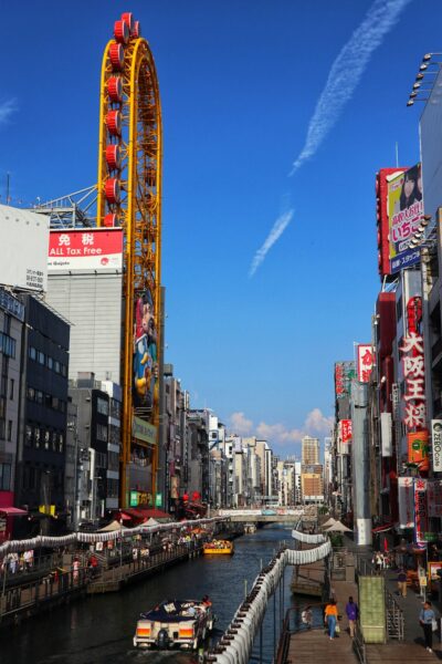 Voor 600 yen heb je een wa- wa- waanzinnig goed uitzicht over de rivier in Dotonbori. Maak aan het einde van de middag een ritje in het reuzenrad, die je vindt in de straat ‘the kitchen of Japan’.